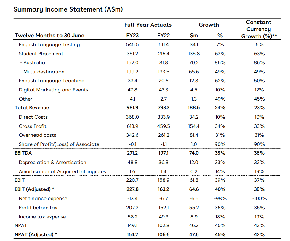 * EBIT (Adjusted) and NPAT (Adjusted) excludes merger and acquisition expenses which related to the acquisition of Intake Education and The Ambassador Platform in FY23, the acquisition of the British Council’s Indian IELTS operations in FY22 and consultancy and professional expenses incurred in shareholders’ restructure project in FY22. It also excludes acquired intangible amortisation.